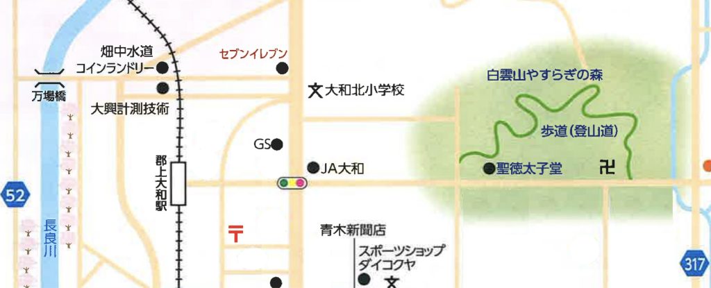 「やすらぎの森」の周辺には「道の駅やまと」や温泉施設があり、散策や登山とあわせて立ち寄れるのも嬉しいポイント。